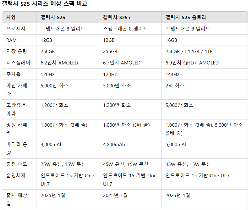 갤럭시 S25 시리즈는 기본형, 플러스형, 울트라형으로 나뉘며, 각 모델마다 특징이 다릅니다. 아래의 표를 통해 각 모델의 스펙을 비교해 보겠습니다.