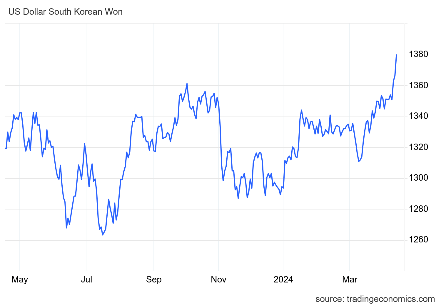 2023년 5월부터 2024년 3월까지의 원달러 환율 변동 추이를 나타낸 선 그래프입니다. 이 그래프는 전체적인 환율 흐름을 한눈에 보여주며, 특히 최근 상승세가 두드러지죠.