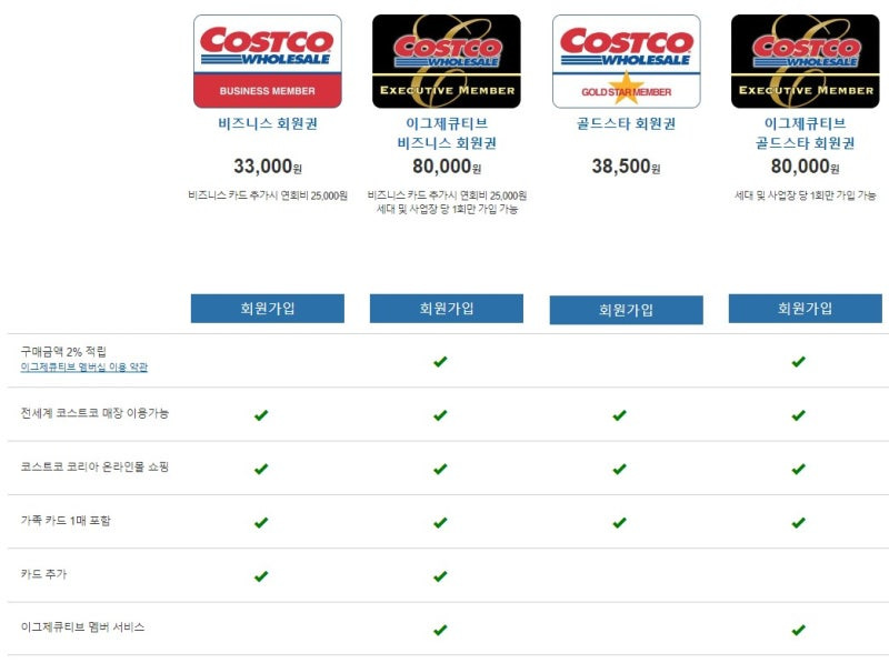코스트코에는 여러 종류의 회원이 있어요. 각 회원의 혜택과 비용은 다음과 같답니다.