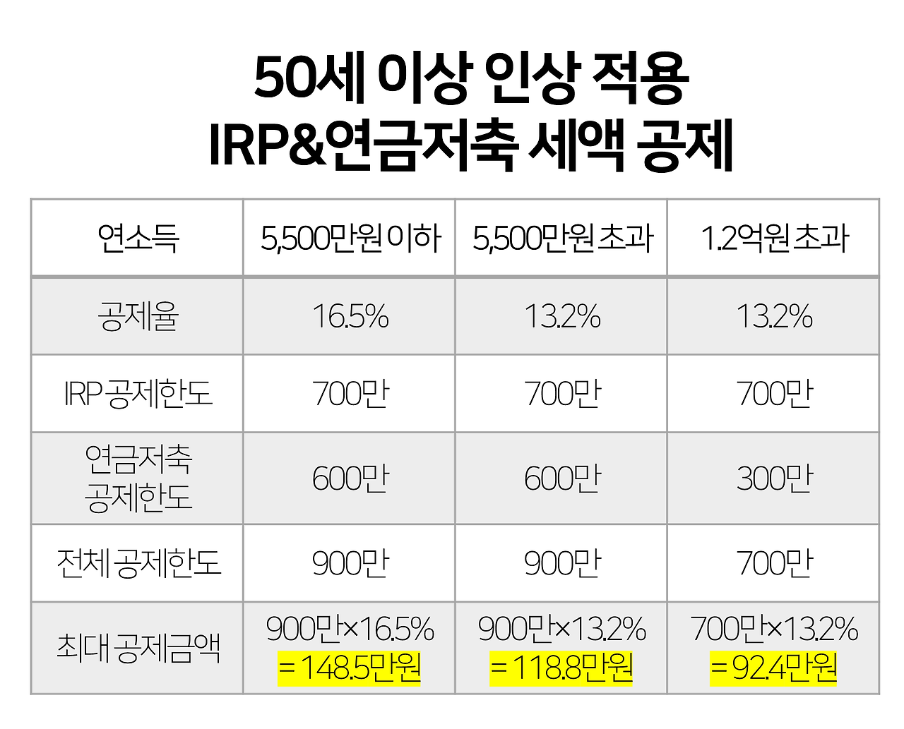 또한, 50세 이상의 경우 추가적인 세액공제를 받을 수 있는 혜택이 있습니다. 이 경우, 연금저축과 IRP를 합쳐 최대 1,200만 원까지 세액공제를 받을 수 있습니다.
